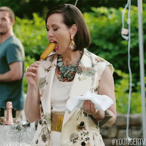 Diana Trout (Miriam Shor) reacts with disgust after biting into a corn dog at an outdoor party.