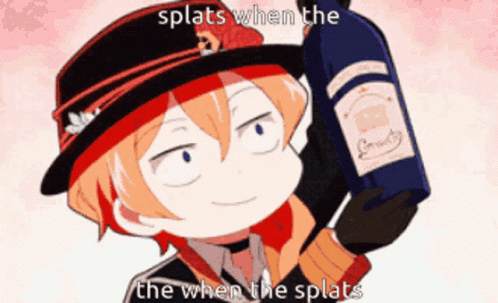Chuuya Nakahara from BSD holds a wine bottle in a 'splats' meme, with text overlay.