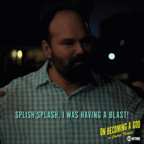 Mel Rodriguez as Ernie enthusiastically exclaims, 'Splish Splash, I was having a blast!' from On Becoming A God In Central Florida.