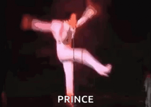 Prince performs an iconic split dance on stage, illuminated by a blue spotlight.