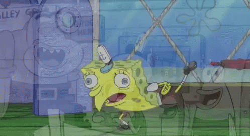 SpongeBob SquarePants performs his iconic mocking chicken-like dance, widely used as a meme.