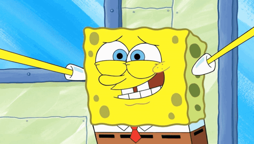 Spongebob Squarepants with exaggerated, wide, pleading eyes, looking adorable and begging.