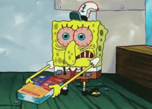 Spongebob Squarepants looks stressed and exhausted while holding a stack of books, representing the struggle of Step1 exams.