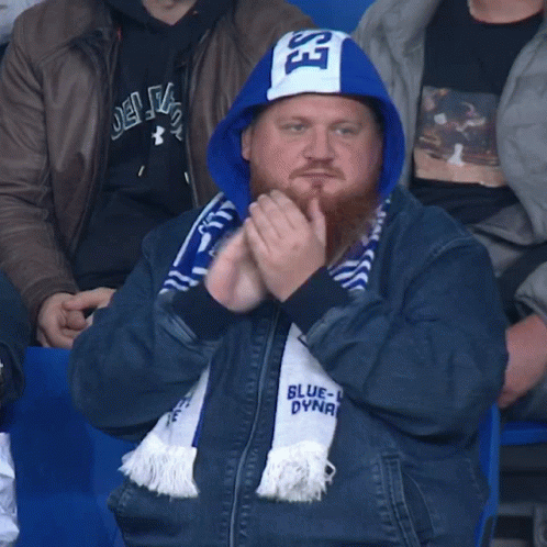 A dedicated Dynamo Moscow fan, wearing a team scarf and hat, claps enthusiastically at a football match.