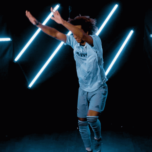A Sporting Kansas City soccer player celebrates with arms raised in a light blue Adidas kit, showing jubilation.