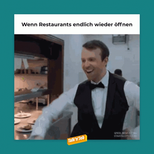 A waiter in a uniform dances excitedly in a kitchen, celebrating restaurants reopening, with the text 'Wenn Restaurants endlich wieder öffnen'.