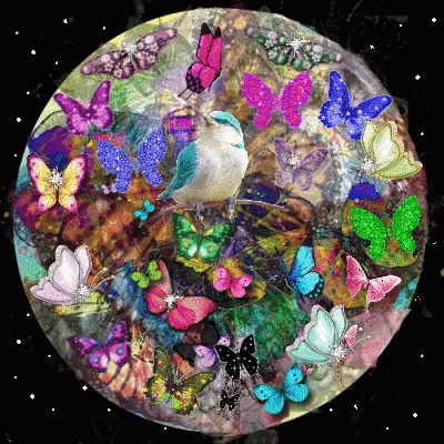 A beautiful blue bird surrounded by numerous colorful butterflies, set against a vibrant, moon-like backdrop.