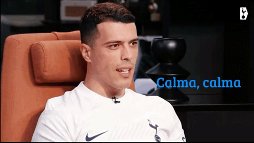 Pedro Porro, wearing a white Nike shirt, sits in an orange chair, with 'Calma, calma' displayed on screen.