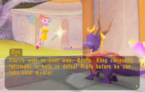 Zoe encourages Spyro to collect talismans to defeat Ripto before he takes over Avalar in this classic Playstation game.