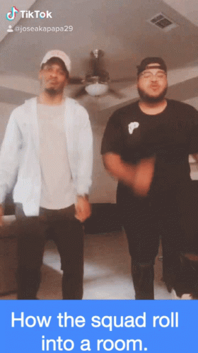 Two men demonstrating 'How the squad roll into a room' with a synchronized dance routine.