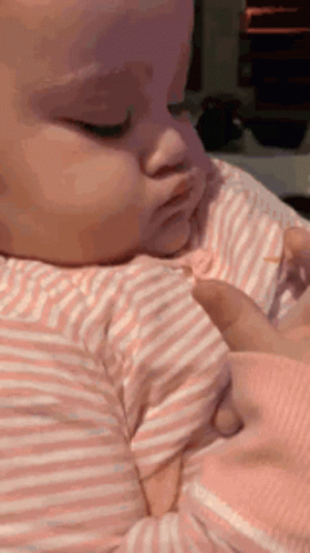 A cute baby in a pink and white striped shirt has its cheeks gently squeezed, making funny, irritated expressions.