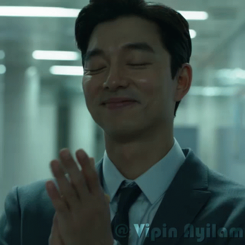 Seong Gi Hun from Squid Game claps enthusiastically in a suit and tie.