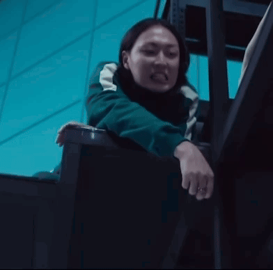 Nam Gyu from Squid Game, also known as Player 124, leans on a railing with an intense expression.