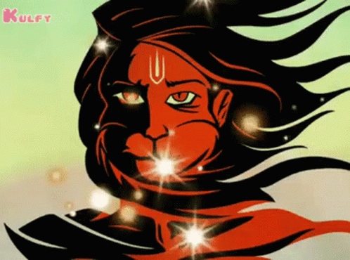 Animated depiction of Sri Bajarang Hanuman, also known as Sri Anjaneyam, with sparkling divine light effects.