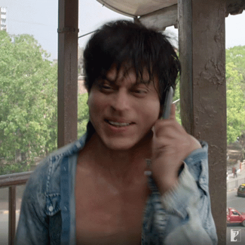Shah Rukh Khan looking excited while talking on a cell phone, wearing a denim jacket.