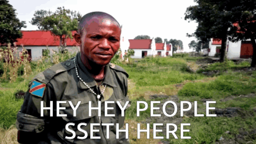 Sseth Ssethtzeentach in military uniform delivers his iconic 'Hey Hey People' greeting.