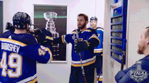 St. Louis Blues players Joel Edmundson and Ivan Barbashev share a high-five in the locker room.
