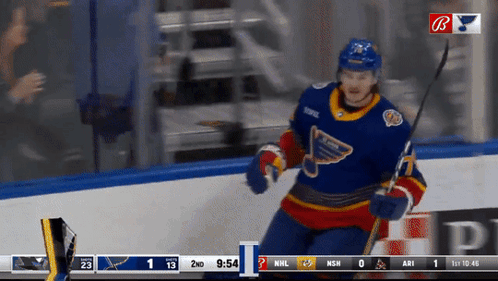 Samuel Blais and St. Louis Blues teammates celebrate a goal during an NHL hockey game.