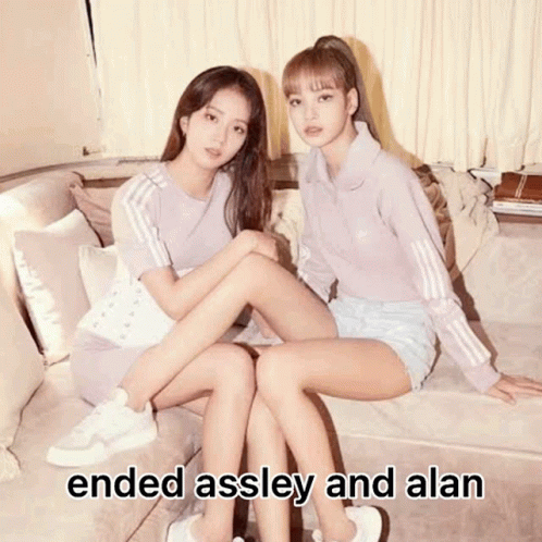 BLACKPINK members Lisa and Jisoo pose for a picture, making peace signs, with a caption 'ended assley and alan'.