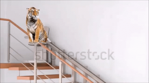 A tiger sits calmly on a stair lift, ascending a flight of stairs.