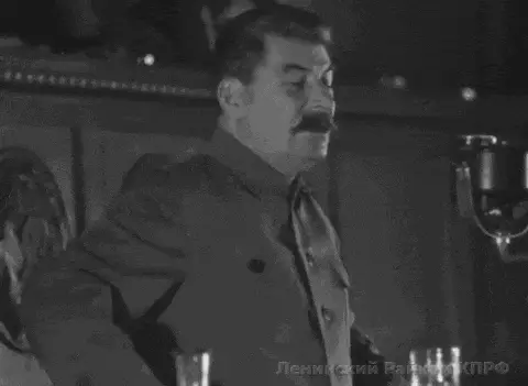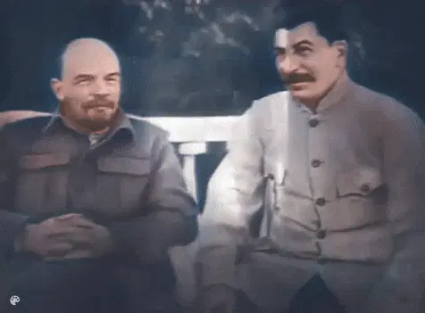Joseph Stalin in military uniform, waving his hand in a black and white animated photo.