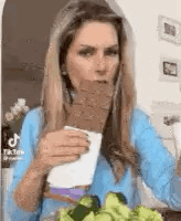Leobylaw eats a large chocolate bar, then takes a bite of broccoli, making a funny face.