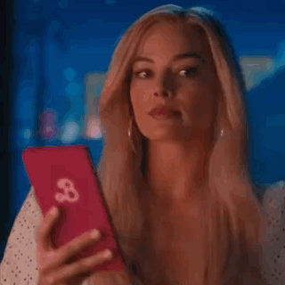 Margot Robbie smiles while holding a pink phone with a Barbie logo, interacting with a social media app.