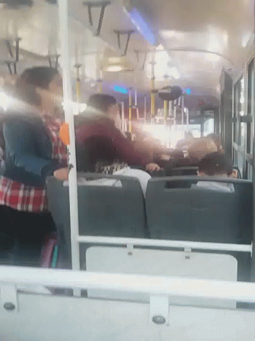 Passengers standing and sitting on a crowded bus, possibly route 252, during a commute.