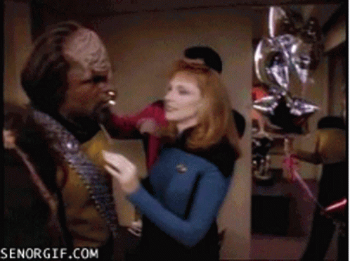 Commander Riker puts a party hat on Worf during a Star Trek birthday celebration, with Counselor Troi looking on.