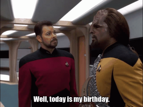 Commander Riker and Worf from Star Trek: The Next Generation discuss Worf's birthday.