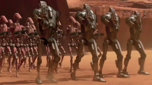 A massive army of battle droids and super battle droids marching across the desert planet Geonosis in Star Wars: Attack of the Clones.