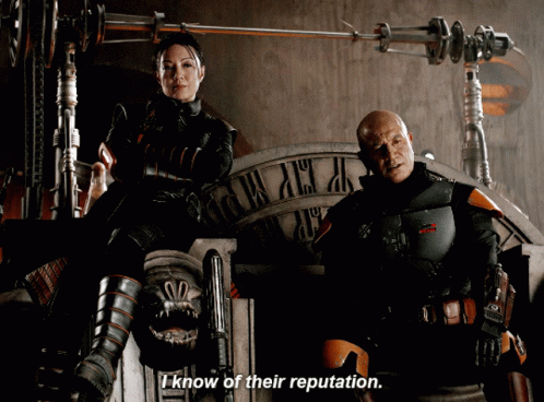Boba Fett (Temuera Morrison) and a companion discuss a reputation, with the companion stating, 'I know of their reputation.'