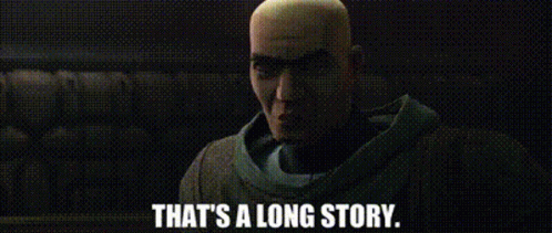 Captain Rex from Star Wars says 'That's a long story' with a serious expression.