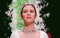 Carrie Fisher as Princess Leia shares a joyful laugh, wearing her iconic white dress and silver necklace.