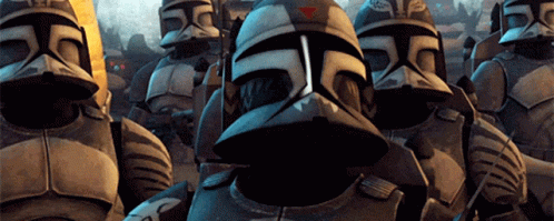Star Wars Clone Jet Troopers from the 104th Battalion stand in formation in The Clone Wars.