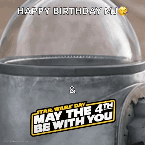 Grogu waves from his pram, celebrating Happy Birthday MJ and Star Wars Day with the iconic 'May the 4th Be With You' message.