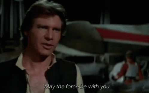 Han Solo delivers his iconic line, "May the force be with you," in a memorable scene from Star Wars.
