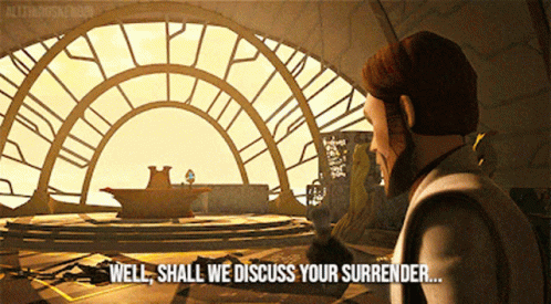 Obi-Wan Kenobi asks, 'Well, shall we discuss your surrender?' in a dramatic Star Wars scene.