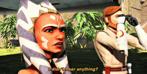 Ahsoka Tano asks Obi-Wan Kenobi if he heard anything while he looks through binoculars in Star Wars: The Clone Wars.