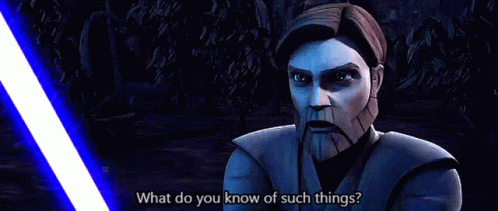 Obi-Wan Kenobi from Star Wars: The Clone Wars asks a pointed question, holding his blue lightsaber.
