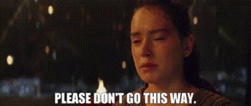 Rey, portrayed by Daisy Ridley, expresses distress with the plea 'PLEASE DON'T GO THIS WAY' in a Star Wars scene.