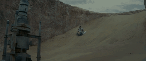 Rey (Daisy Ridley) slides down a sand dune on a makeshift sled in the desert.