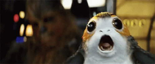 A surprised Porg with its mouth open, with Chewbacca blurred in the background from Star Wars: The Last Jedi.