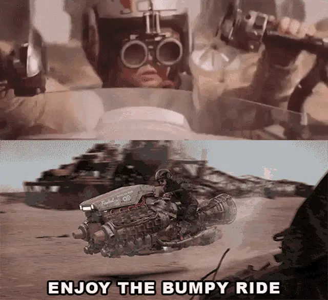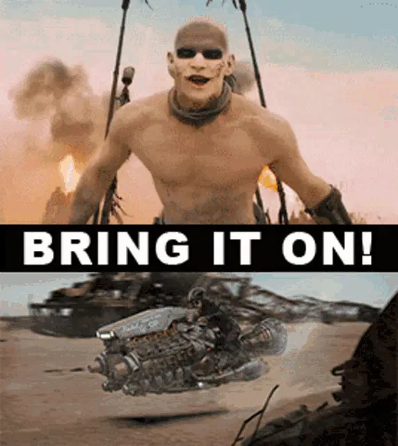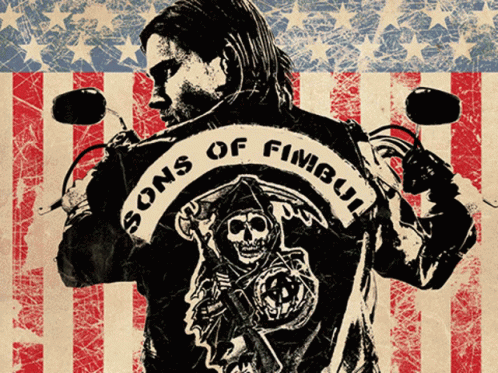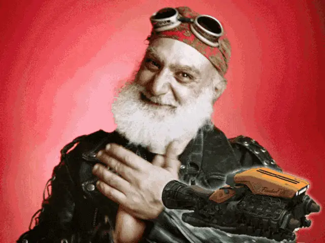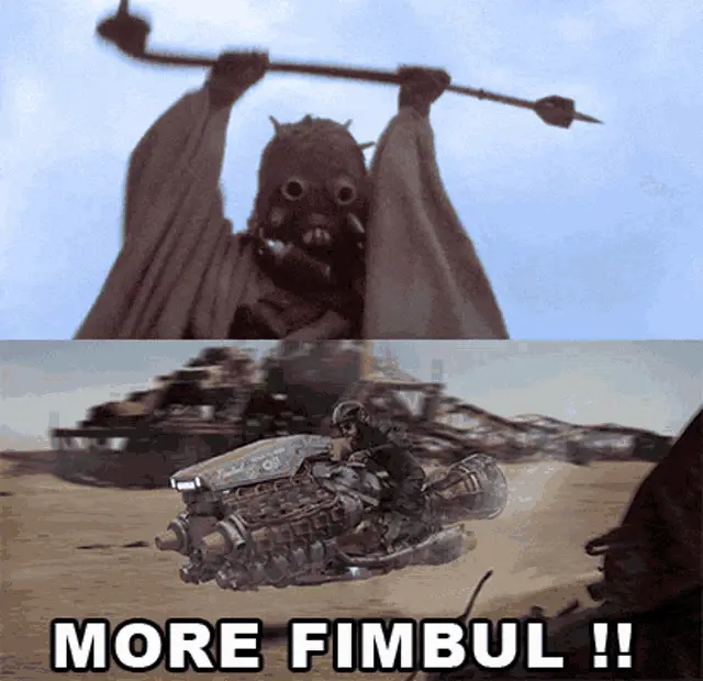 A biker with a 'Sons of Fimbul' jacket and an older man with a Fimbul Airbike engine from Staratlas.