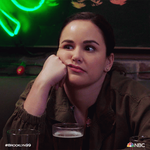 Melissa Fumero as Amy Santiago gives a judging stare, resting her chin on her hand at a table.