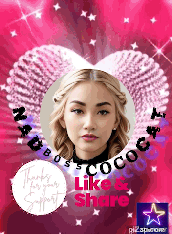 A vibrant portrait of Boss Coco, featuring her face within a heart-shaped design, with 'Like & Share' text.