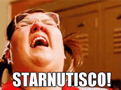A woman wearing glasses makes a funny face while sneezing, with the Italian word 'STARNUTISCO!' (I SNEEZE!) displayed.