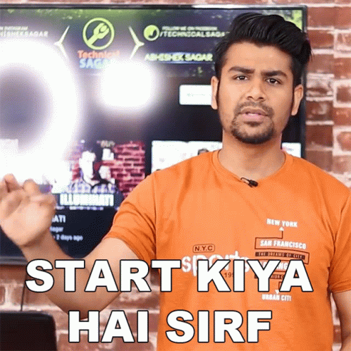 Abhishek Sagar, wearing an orange shirt, says 'Start Kiya Hai Sirf' in front of a screen.