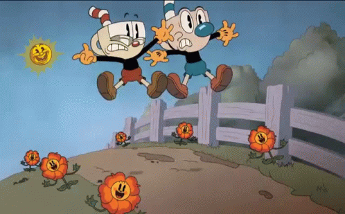 Cuphead and Mugman go from a joyful day with fireworks and flowers to a spooky night in a graveyard with ghosts.