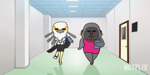 Aggretsuko characters Washimi and Gori walking in a hallway, with Washimi looking startled.